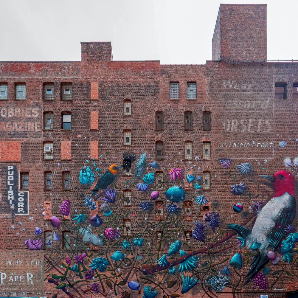 Dutch artist, Collin Van Der Sluijs, used a variety of mediums such as spray paint and acrylics to achieve this enormous image. It highlights two endangered birds in the Chicago area; the yellow-headed blackbird and the red-headed woodpecker. The birds are surrounded by native flowers found in the city.