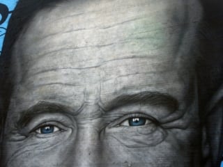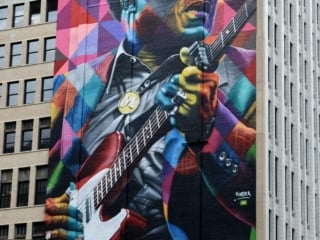 This mural of Chicago blues musician Muddy Waters was created in 2016 for the Chicago Blues Festival. This celebration in Millenium Park takes place every year in June. Kobra, who also made the Vivian Maier mural, is known for his portraits of famous people that are bright and colorful.