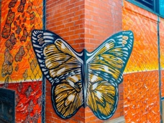 This colorful installation is found on the side of Columbia College and has a place for two different photo ops when you visit. The first one can be done in front of the burst of multiple monarch butterflies that look as if they are flying off to the right.