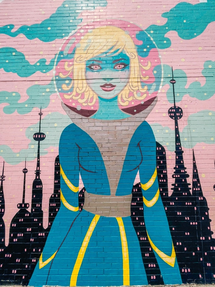 This mural gives off a major (updated) Zenon: Girl of the 21st Century vibe. At the time of my visit, there was a section of the street that was closed off so it was easy for me to take pictures of the whole mural without having to do too much work.