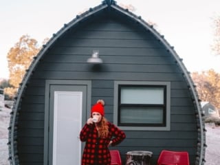 Hot dang this would make a great honeymoon Airbnb California for any adventurous newlyweds. My husband and I spent a few days at Sierra Meadows tiny cabins last fall. It's in Oakhurst, just outside Yosemite National Park. These cabins are SO COOL - they have a bed, fridge, outlets and heating inside.