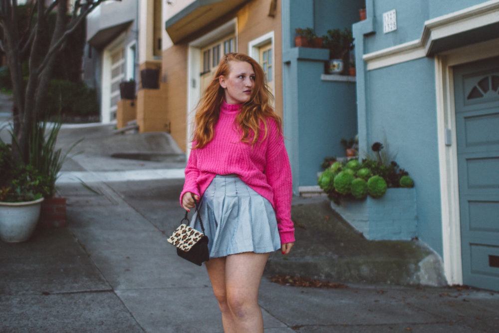 I’m wearing what I think is the fuzziest pink sweater on the planet (my cat agrees, she loves sitting on it.) I paired it with this cute houndstooth skirt, black boots, a grey coat to match, and a leopard purse for a little pop of fall fun. Linked them all below!