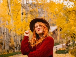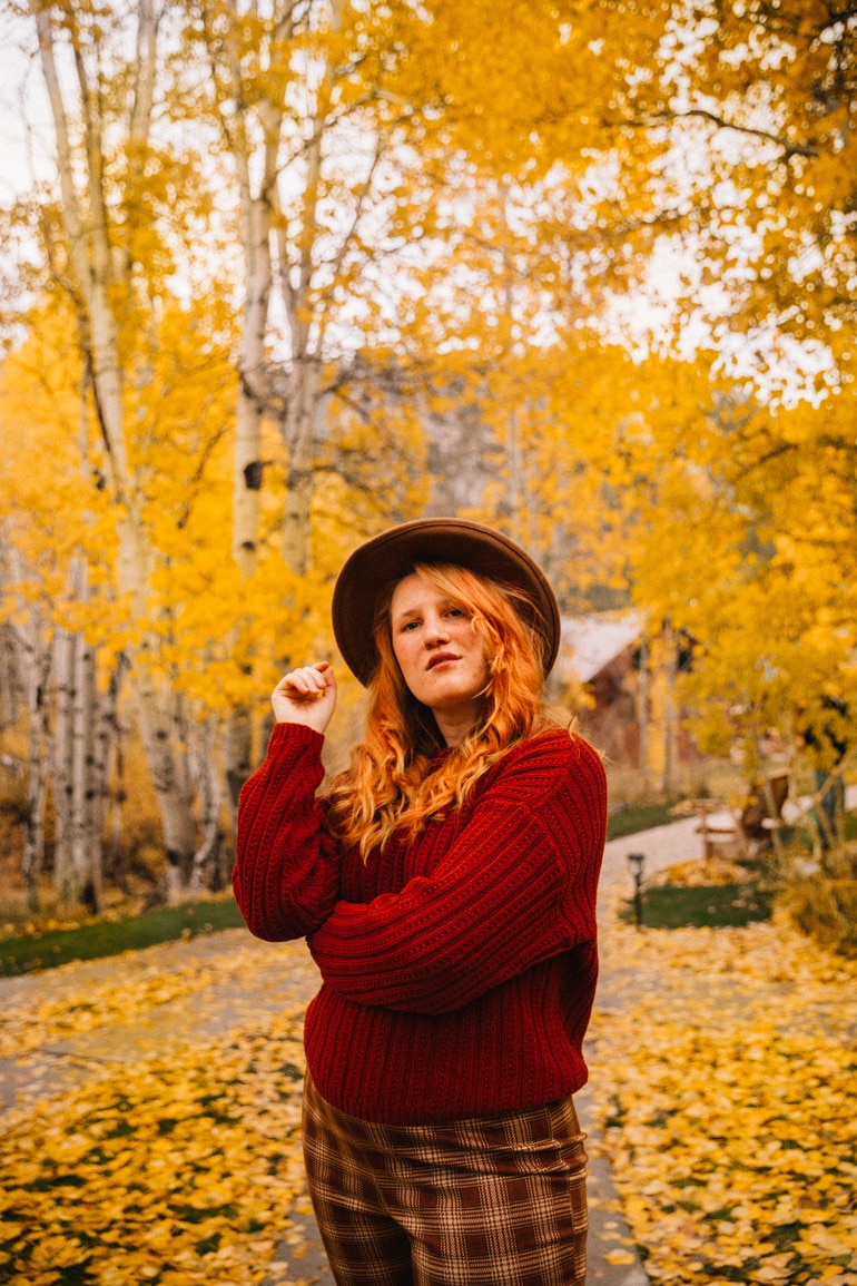 On a breezy fall day, hold onto your hat as the wind tousles your hair, adding a touch of whimsy and spontaneity to your photoshoot.