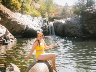 After exploring the sea cave, we drove over near the entrance of Yosemite National Park to go swimming at Rainbow Pools, a magical little waterfall with a large basin you can swim at! Even though we arrived at 9:30am, there were already a ton of people there sneaking in a quick splash before heading into the park for hikes.