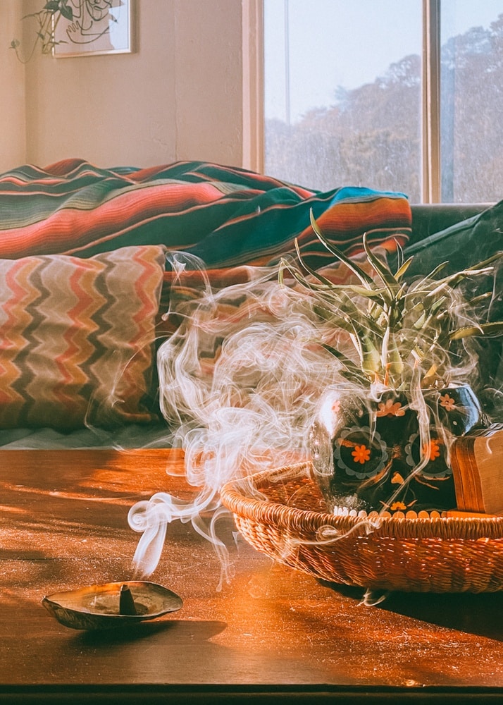 At the end of your ritual, you’ll want to close your sacred space so you can move into the rest of your day feeling grounded and empowered. You can close your sacred space by simply blowing out the candles or extinguishing any smoke bundles or incense, turning off the music, doing some deep breathing, or ringing a bell or chime.