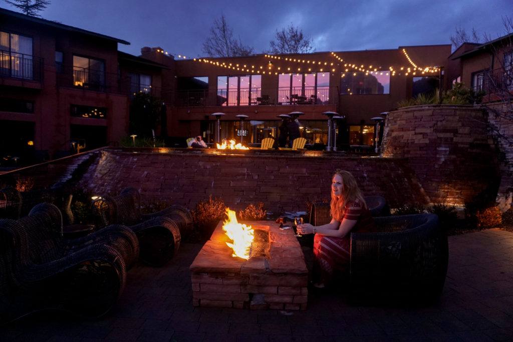 5pm: Happy hour! We brought our drinks out to the courtyard to sit by the fire and watch the sunset over the red rocks. I love dusk – when the sun is high enough you can still see, but low enough that string lights feel magical and there’s a great energy in the air. We stayed until about 6pm, when Robin wanted to head back up to the room to watch the Packers play in the playoffs. Boys.