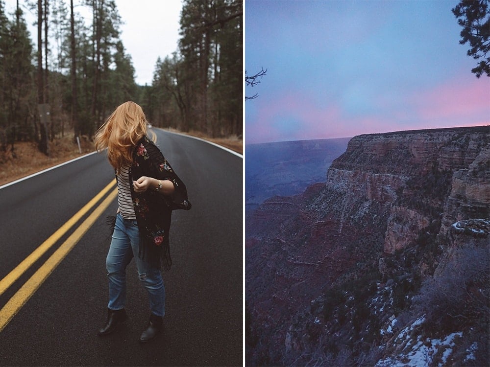 4pm: So, in the winter the North Rim is closed down and only the South Rim is open. I’d love to come back and spend a few days at the Canyon to really explore it, but I thought the South rim was a great first visit. It’s chilly here in the winter and we were glad we brought jackets! To pros of visiting in the winter is there are far less tourists and we were able to enjoy a pretty empty and peaceful walk along the rim at golden hour. There are a lot of great lookout points to enjoy and snap photos from.