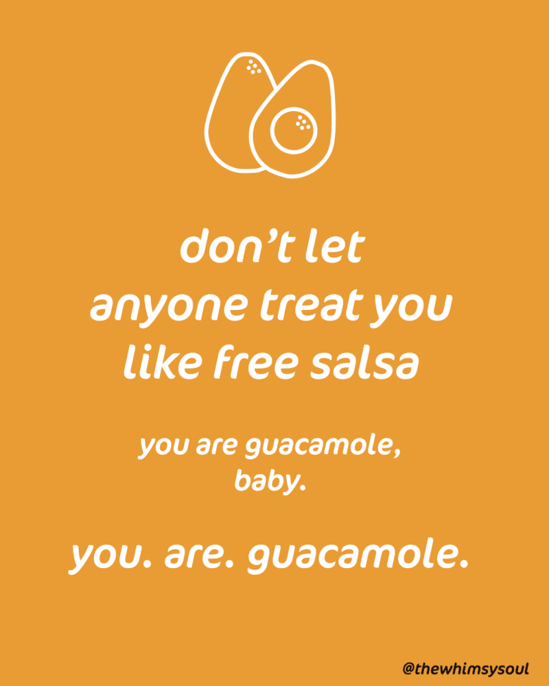 Don’t let anyone treat you like free salsa. You are guacamole, baby. You. Are. Guacamole.
