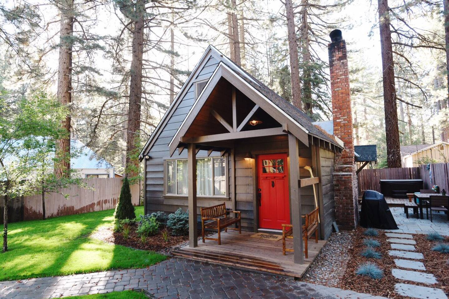 A small cabin that feels more like a summer cabin than a rustic lodge with pops of color, trendy decor and a large back patio complete with string lights over the hot tub. If you plan on spending a lot of time outside, this is the cabin in South Lake Tahoe for YOU!