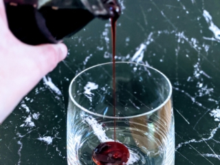 Start by pouring about 1 ounce of juice from a jar of Luxardo maraschino cherries into an empty glass. (Note: Only Luxardo cherries have that dark scarlet color we’re going for, so be sure to get this brand!) Tilt to coat the bottom. Fill the glass with crushed or pellet ice, and then complete the recipe as usual for a stunning scarlet-purple-pink concoction.