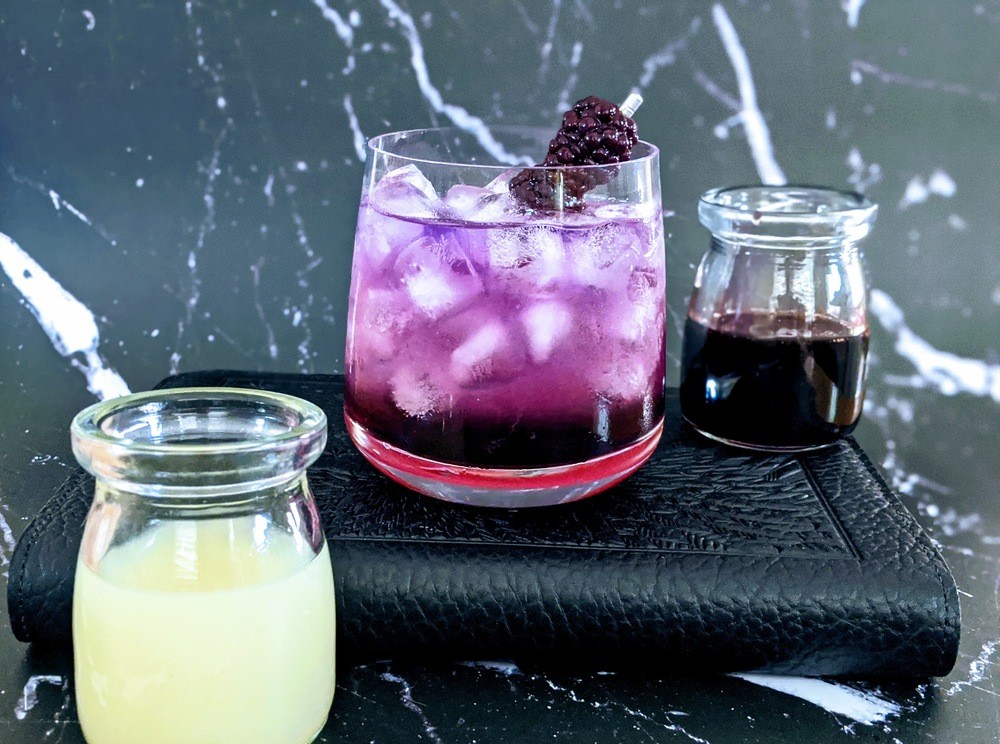 - Slowly drizzle the crème de mûre over the top so that it seeps down into the glass (kinda like Agatha’s smoky-black-purple magic).