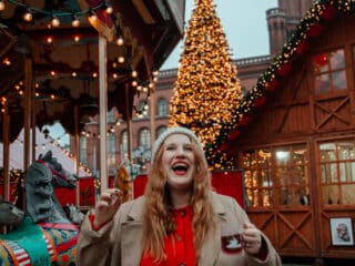 I wore this outfit to the Christmas Markets. The skirt is from Cupshe, the bright red sweater is from Sezane and the camel coat is Old Navy. It wasn’t raining or snowing this night so this outfit kept me warm enough as we sipped wine and ate all the food.