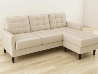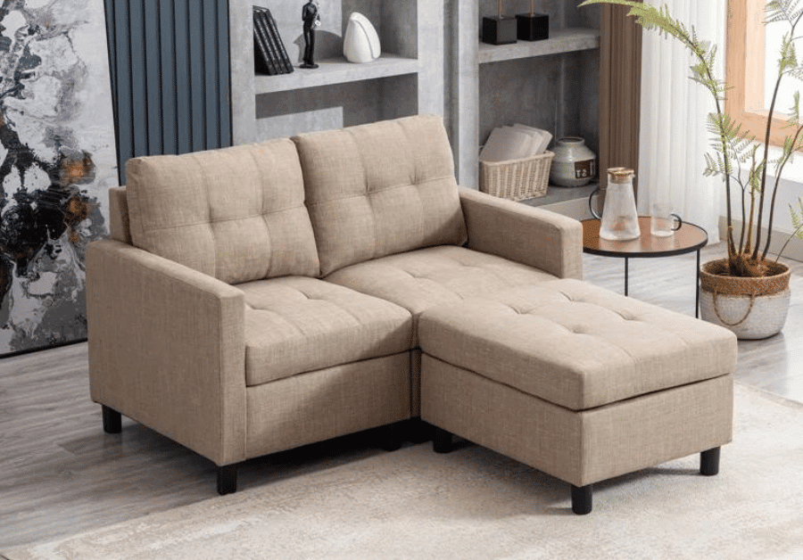 This sectional sofa has a compact interchangeable design features a fab floating chaise that can be positioned on either side for full-on versatility and comfort. It has black cone legs, a mailbox arm design, and tufting on its seat. It doesn't come with an ottoman but you can place a nice coffee table in the middle or purchase additional ottomans to make it extra cozy in your small space.