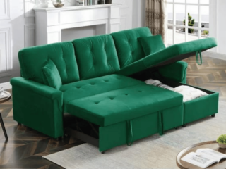 Another green velvet couch! *swoon* This is a neat sectional sofa because it has a pull out sleeper!!! I hate blowing up our mattress whenever someone sleeps over, so having an option to extend this into a bed is so smart. If you live in a small space and love to have people stay over, this couch if for you!