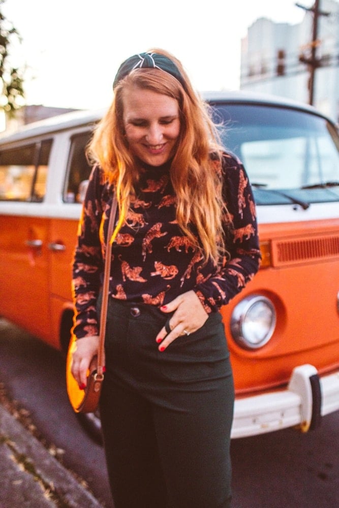 I’m wearing a size 12 and they fit perfectly. For this outfit, I paired together with a fun tiger print turtleneck (which is lightweight for transition seasons!), a green headband to match the pants and leopard shoes, as leopard ALWAYS goes well with green.