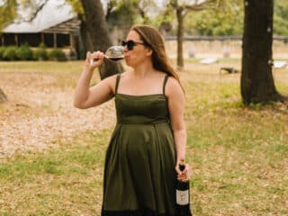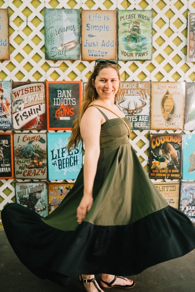Look how cute my friend is!! This is what she wore while wine tasting Texas. It’s a sweetheart midi dress in dark green and black. She has a more preppy/classic style compared to me and I love showcasing other people’s sense of fashion in these guides.
