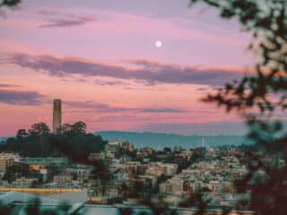 But pop behind the tow of trees and BOOM, you’ll see an amazing view of the skyline, Transamerica Building and Coit Tower. It faces east, so you’ll see all the clouds and pink sky that way.