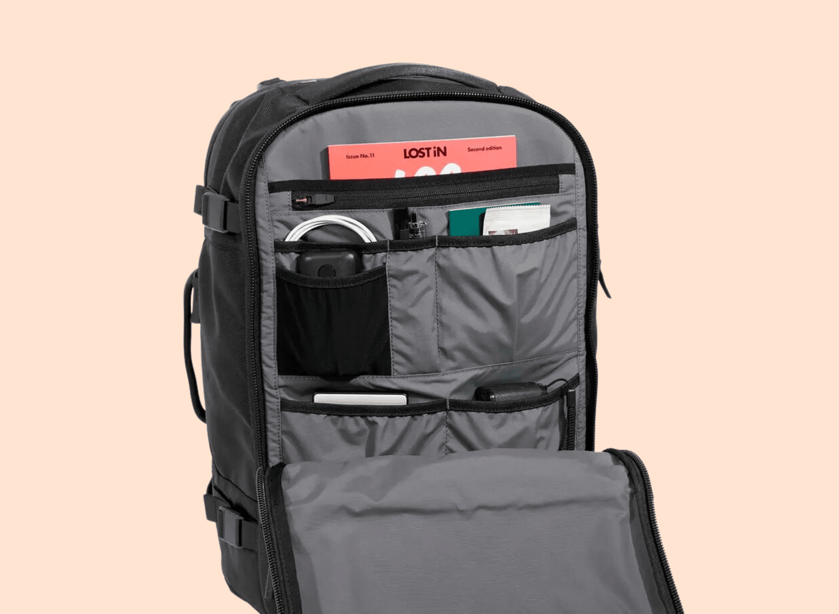 The Aer Travel Pack is great for folks who want or need an entire section of their pack to organize electronics and small items. There’s no zippered mesh pockets but are a TON of pockets in an entirely different sleeve of the pack, so you can keep your laptop, phone chargers and other goodies tucked away from your clothes.
