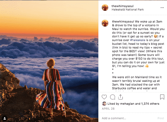 For example, let’s say you’re visiting Haleakala in Maui like I am in the above Instagram photo. On top of using #visitmaui (the official Maui tourism board hashtag) and #lethawaiihappen (the Hawaii state hashtag), I’m tagging @Haleakalanps in the photo. I’m also tagging the tourism board account for the whole state and Maui too.