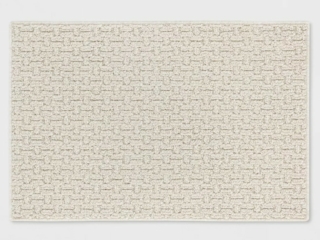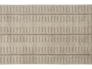 It’s very neutral, with a mid-century modern design. The rug features raised strips of wool that give it a very toned down striped quality.