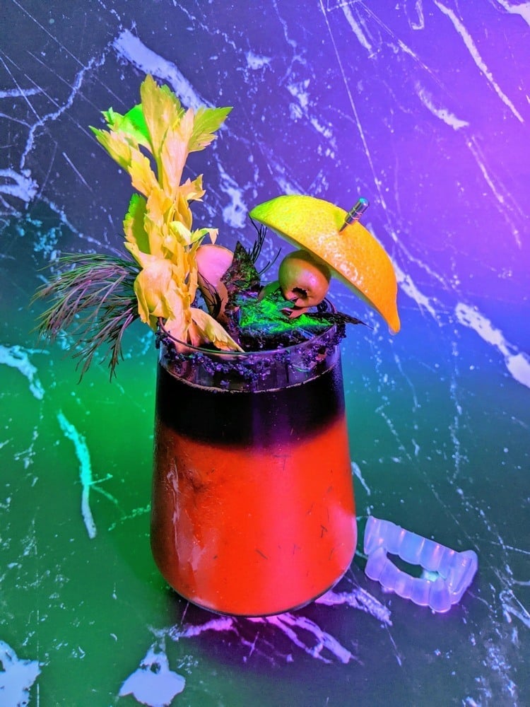 Savory, salty, and spicy, this macabre twist on the classic Bloody Mary doesn’t suck. Tempting to vampires but made for regular humans like Jackie Daytona.