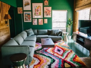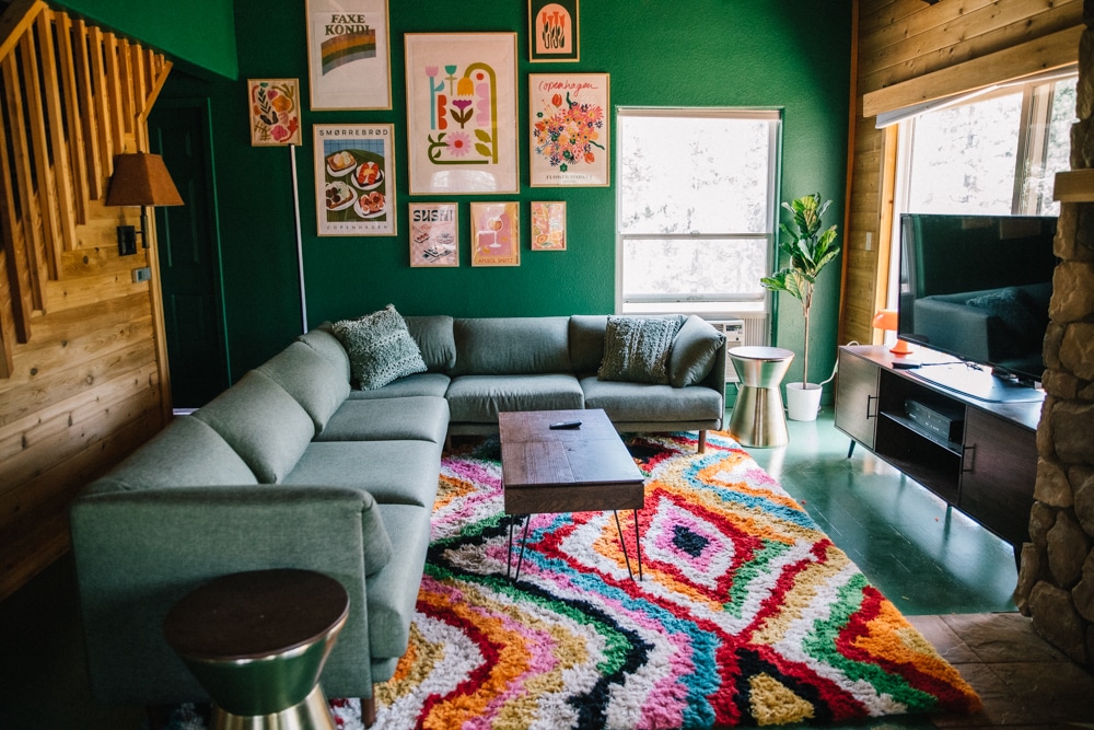We had decided to really lean into green for the cabin living room decor with green walls and a green floor (yes, for real), and to keep the visuals consistent, I put a green couch in there, too.