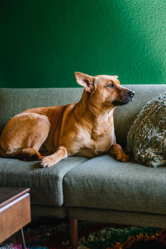 We have been keeping the couch covered with blankets but she’s been able to sneak her way around them many times and I’m thrilled that the fabric is holding up super well. I love our little green velvet couch in our apartment but MAN, she sunk her claws into that and you could tell right away.