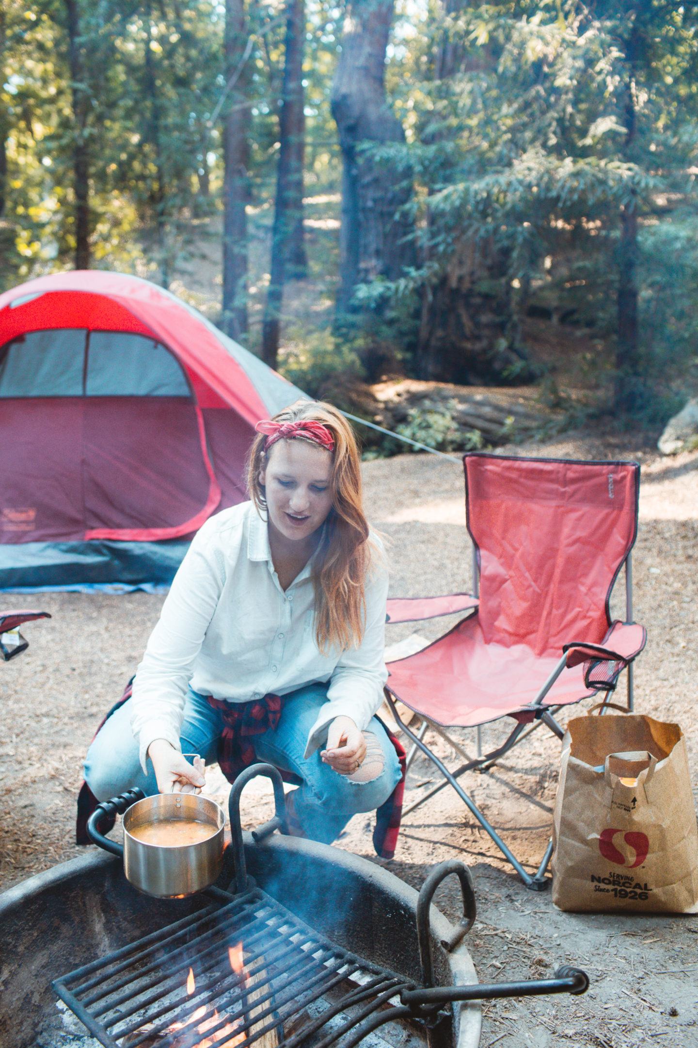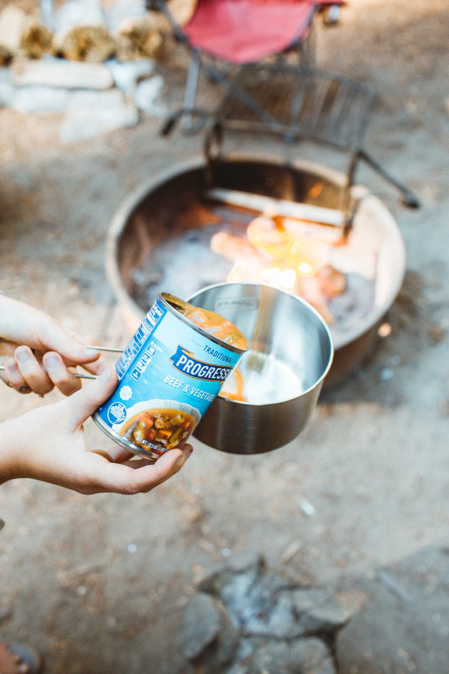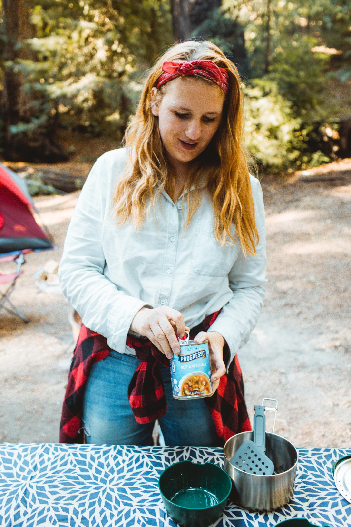 On our way down to Big Sur a few weeks ago, we swung by the Safeway in Carmel to pick up a few cans of Progresso Beef & Vegetable soup, which is really easy to cook over the fire for lunch or dinner. It takes about 10 minutes and can be done all in one pot, so it’s a really easy clean-up! Soups and other simple one-pot things like beans and rice, or pasta, are my favorite meals to make while camping. Easy, simple, tasty!