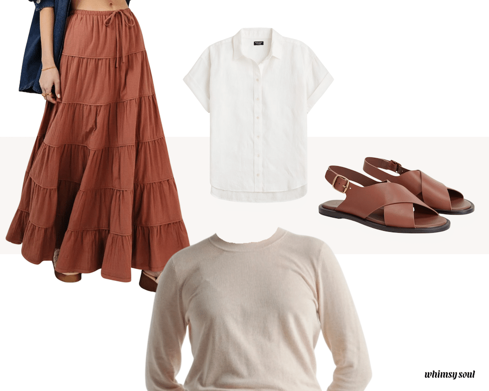 As the evening cools down in Copenhagen, a flowy skirt paired with a boxy short-sleeve shirt creates a relaxed yet stylish look. This combination is perfect for a casual dinner by the harbor or an evening walk in the city’s beautiful parks.