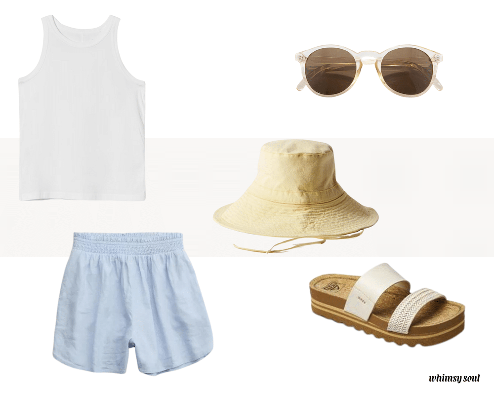 Complete the look with a bucket hat and sunglasses to protect yourself from the summer sun while adding a trendy edge to your outfit. This casual and practical ensemble is perfect for a laid-back day exploring the best of what Summertime Copenhagen has to offer.