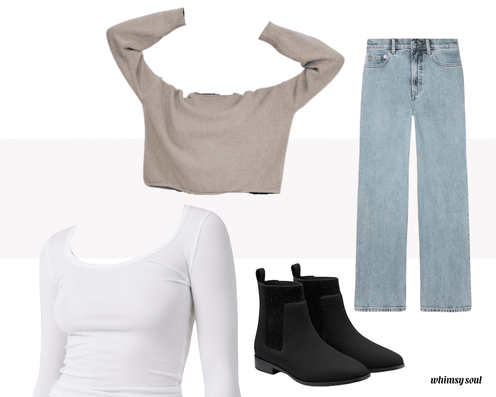 For a chic winter look while strolling through the charming streets of Copenhagen, start with a pair of classic jeans and a cable knit sweater.