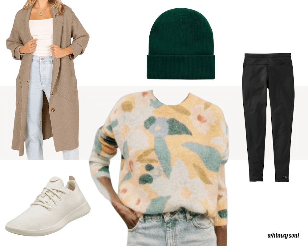 Top off your look with a green beanie hat to compliment the sweater and add another layer of warmth. Finish with these Allbird machine washable wool runners for comfort and insulation.