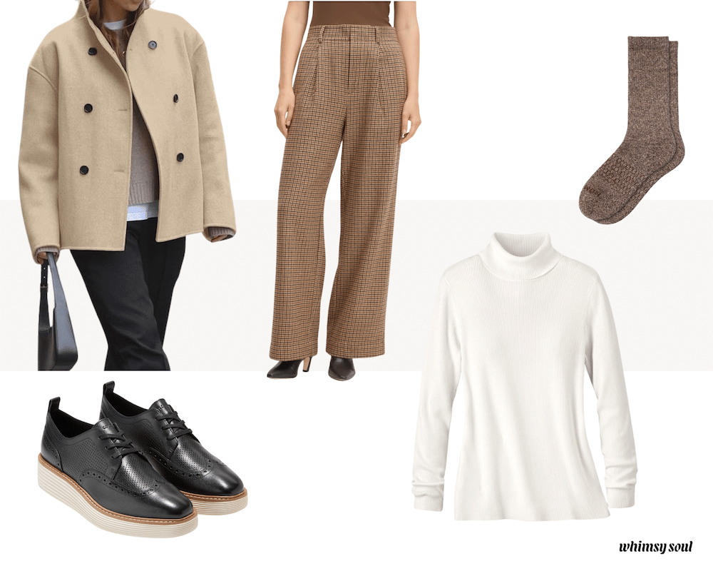 Elevate your style for a museum day in Copenhagen with a sophisticated academic look. A sleek turtleneck paired with houndstooth wool pants sets a smart and polished tone.