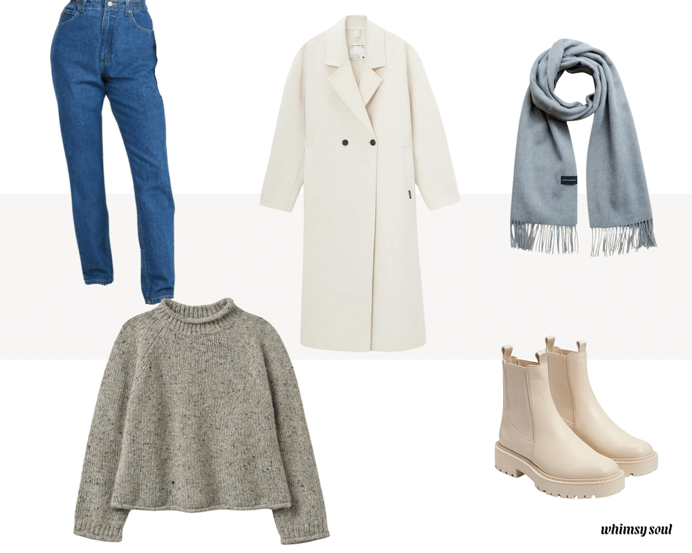 For a cozy winter dinner in Copenhagen, opt for a subtle, natural look featuring hues of blues, whites, and greys. Start with a pair of well-fitted jeans and a wool sweater for a relaxed yet chic vibe. Layer with a fog-colored coat to add sophistication and warmth.