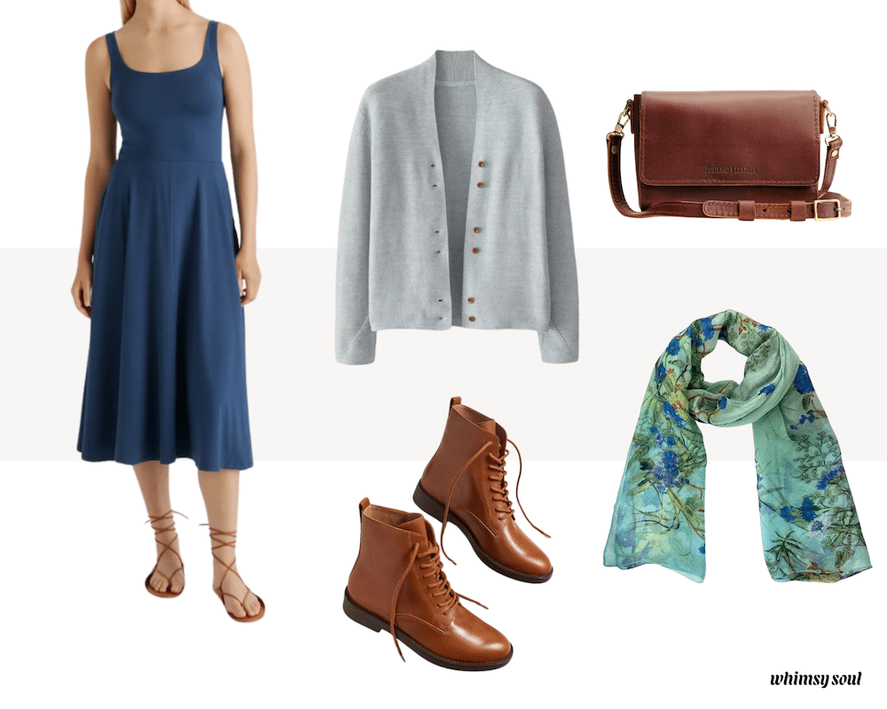 Don’t forget your comfortable boots–like these Vivaia square-toe water-repellent ankle boots—ideal for navigating cobblestone streets and staying dry in unexpected showers. This outfit is practical yet stylish, making it easy to enjoy the city’s sights.