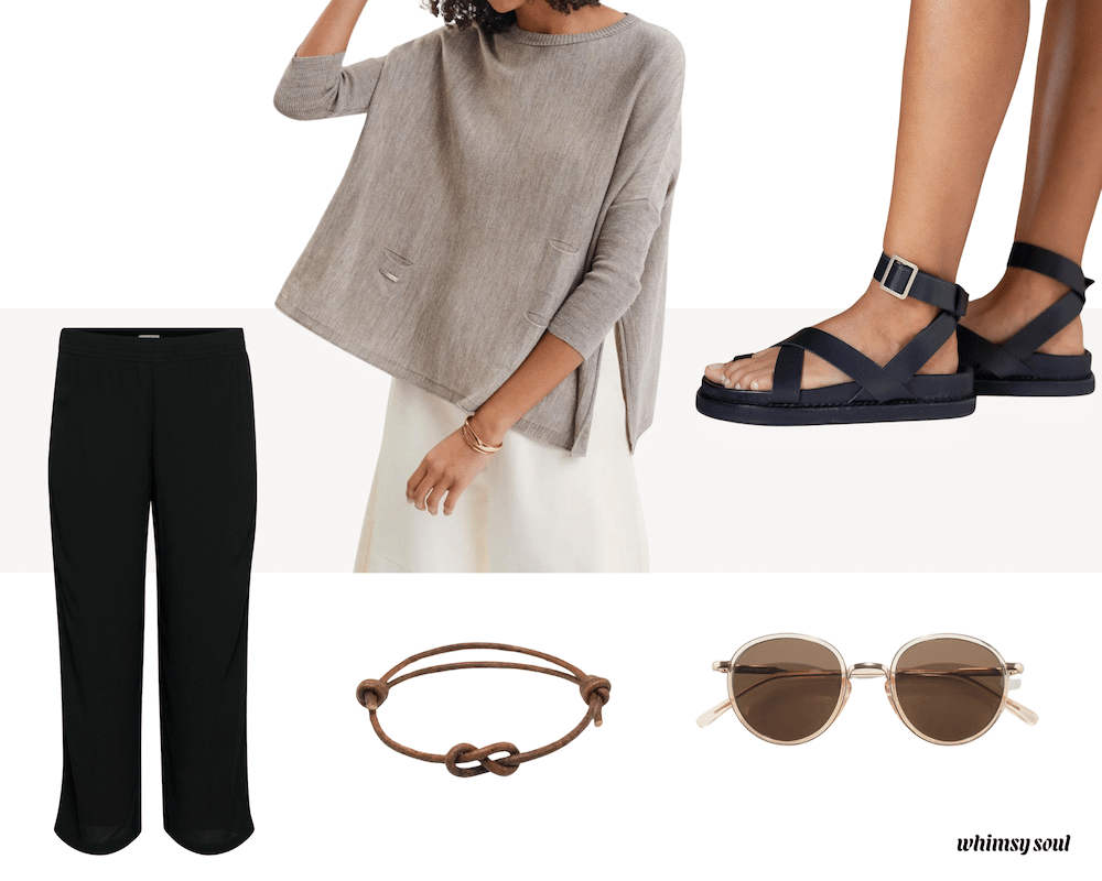 Finish off the outfit with a leather bracelet for a touch of sophistication. This outfit ensures you’re ready for anything, whether it’s exploring museums, shopping, or enjoying a leisurely walk by the water.