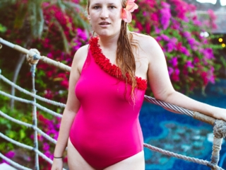 I also think that floppy hats look extra flawless when you wear it with one piece swimsuits, especially classic designs like the suit I’m wearing. This one sadly is sold out but I found this blue one piece suit that’s super similar!