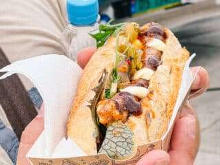 If that’s not your jam, instead swing by the group of food trucks outside the Nobel Peace Prize Museum. On any given day you can find 3-5 food trucks parked there for lunch service. We ate here on our visit and I loved my butter chicken bowl from the Indian truck, and Robin got an Elk Brat from the brat/hot dog truck.