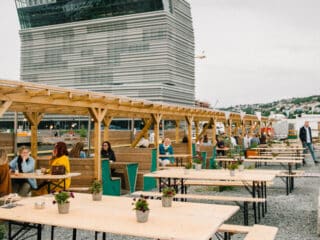 This is a hip beer garden with some food trucks, string lights, tons of seating and views of the fjord and Oslo Opera House. Stop by for a beer or two to kick off happy hour. If you are really hungry and can’t wait for dinner, split a pizza here. OMG, it’s so good. I think we inhaled our pizza in like, 5 minutes flat.