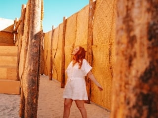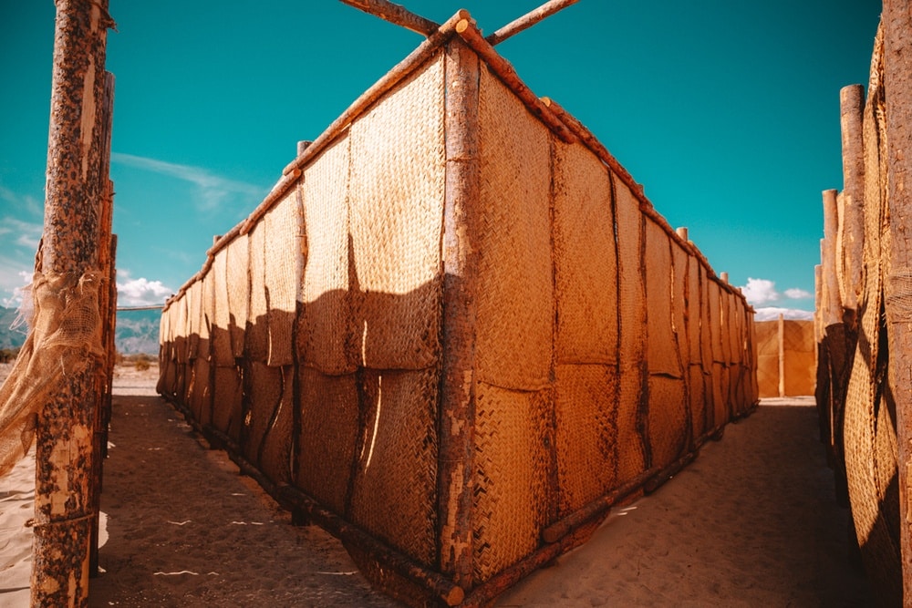 The Passenger was our very first stop on our Desert X treasure hunt and I loved how calm and peaceful it is in the morning light! This piece is a giant triangle-shaped maze made out of traditional rugs woven from palm fibers. The walls are tall and it sits on the sand, so it takes a bit of effort to walk through it.