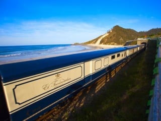 The Blue Train runs between Pretoria and Cape Town. Its interiors are plush with velvet and wood, and meals showcase South African cuisine and wine.