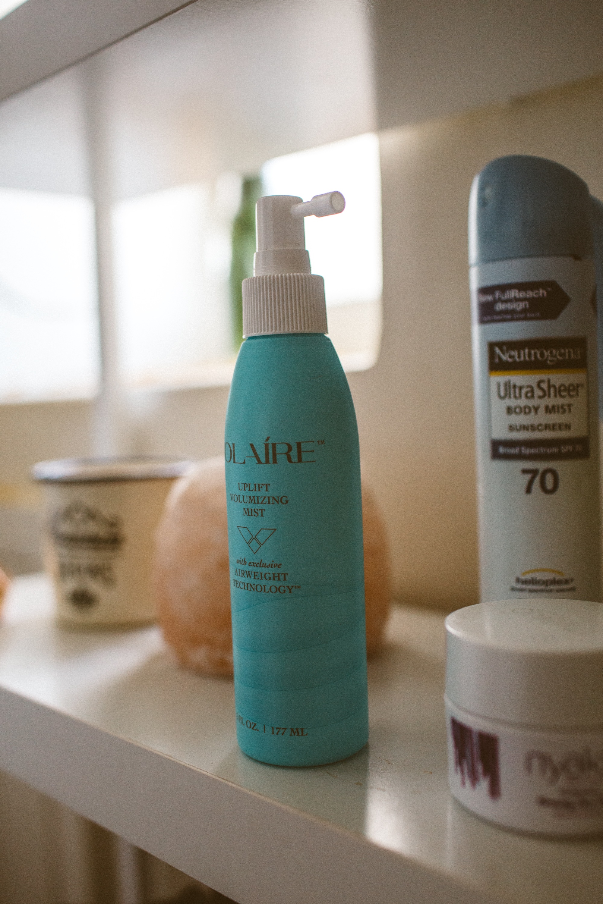 Summer is all about big, full hair, I’m a right? This mist works best when you spray it on wet or damp hair. You can air dry or blow dry, either way is fine. I notice a huge difference in hair bounciness when I use this mist. I’m all about easy beauty in the summer. Just a little BB cream, mascara, bouncy hair and lipstick and BOOM, ready to go.
