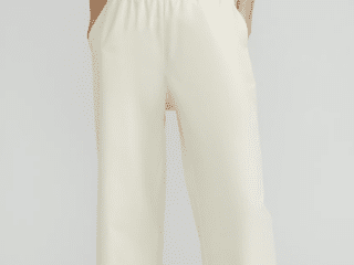 Everlane is famous for this pant. It has a stretchy pull on waistband so no pinching after long days of wear (at the office, on the couch, anything!) We did find during our tests that the fabric feels plasticky.