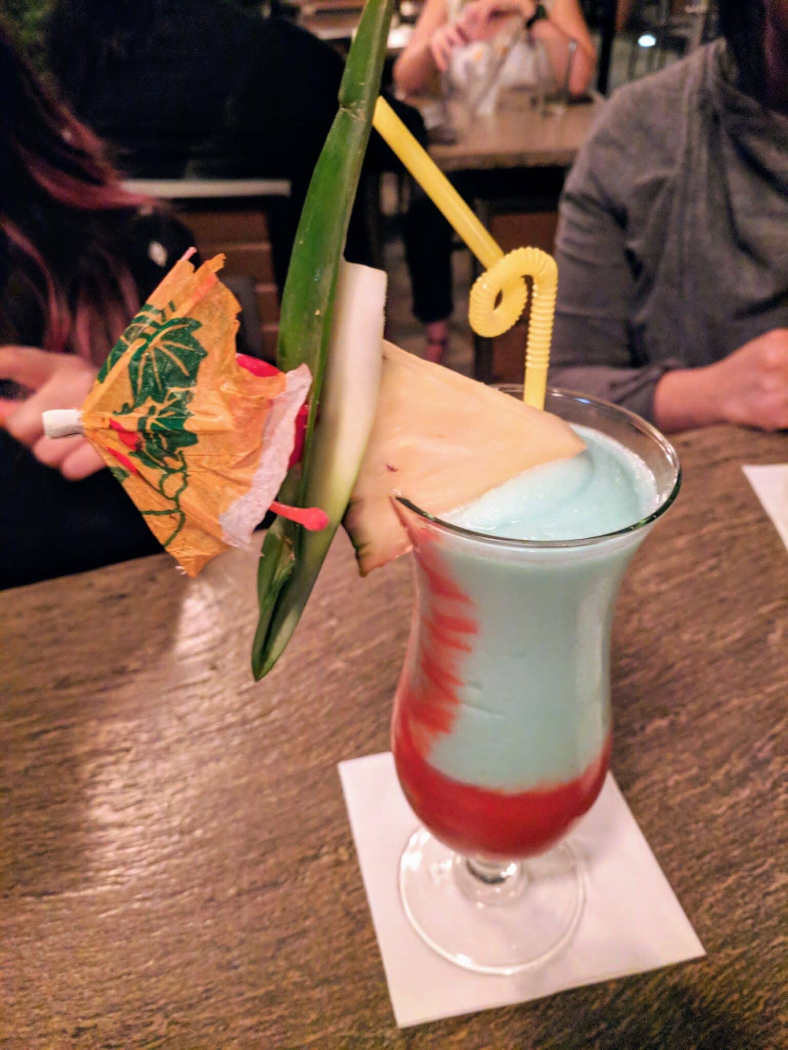 Sure, it’s kitschy and cliche, but I love it. There’s an inviting outdoor patio surrounded by palm fronds and tiki torches, but for the full tiki experience, try your best to get seated inside.