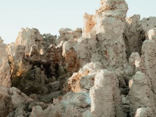 Tufas are rock towers made when underground sources of calcium-dense water percolate up through mineral springs and volcanic vents to mix with the carbonate-rich lake water of Mono Lake.