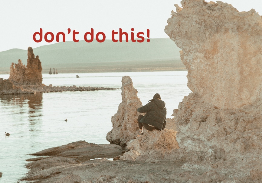 Be VERY mindful of where you step. There are clear sandy footpaths you should try and stick to. Walk around a Tufa Tower to get to the other side instead of climbing over the rocky base and always step on those footpaths (they’re easy to see and for the most part, can take you anywhere you need to go to get a great photo).