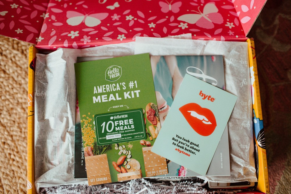 Other things that came in here are promotional flyers and it’s just my pet peeve when I buy something from a store and they sneak these in. If you did want to have a coupon for hello fresh, there you go. All right now to the actual box. So here’s all the stuff that came in. You could have this really nice presentation when you open it. Um, and it’s just like a super fun, like little gift to yourself, Xbox. Totally does that good job of kind of mimicking how you open up a present on Christmas morning. It’s just fun. It’s like a nice little treat for yourself. All right, so let’s start digging into what’s in this box. You know what, before I tell you what’s in the box, I forgot to mention that I didn’t customize this at all whatsoever. When you sign up for a fifth, that fun, God, I did it again, that that button box I have to fill out a little survey and it kind of walks you through like your hair type, your skin type.