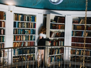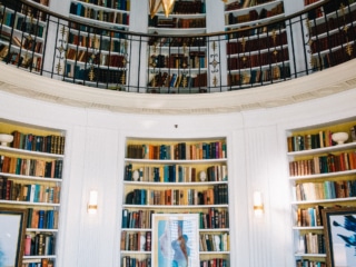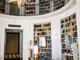 My favorite room is the library, a space that feels like stepping into a celestial dream. A large starburst chandelier hangs in the center, drawing your eye up to the dome ceiling adorned with hand-painted constellations. The shelves are lined with old, rare books, though many first editions were removed for safekeeping after being discovered by the San Francisco Library.