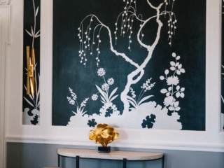 Take the dining room, for example, where the ornate wallpaper reflects the vibrant spirit of Chinatown just a few blocks away, and the fireplace is styled with giant selenite crystal fireplace logs instead of wood.