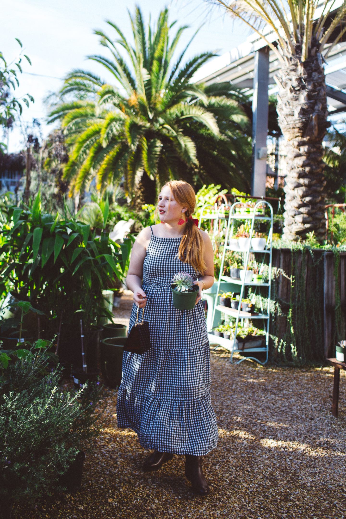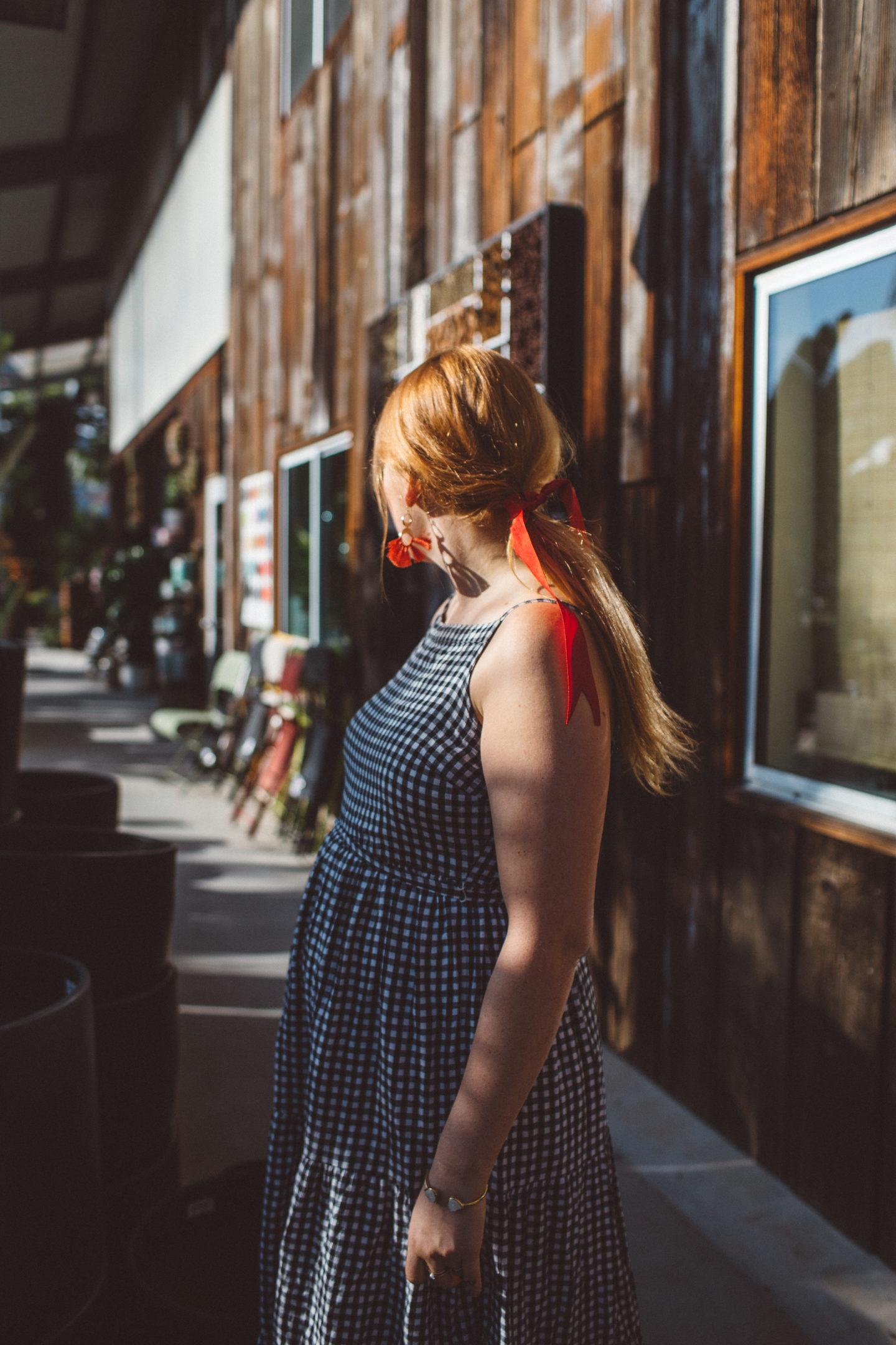 For our morning outing, I wore my favorite gingham dress from Old Navy. It’s from last season, but you can find similar ones here and here. Since it’s winter and a bit chiller, I paired my dress with tall brown boots from White Mountain. I love wearing dresses year-round. Try styling your dresses with tall, warm boots and a sweater if needed. You can usually find me in something like this while running errands in the winter. I topped it all off with a red ribbon in my hair, red earrings and a fun see-through brown purse to match the boots.